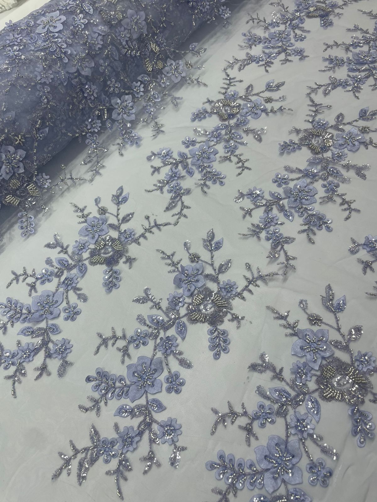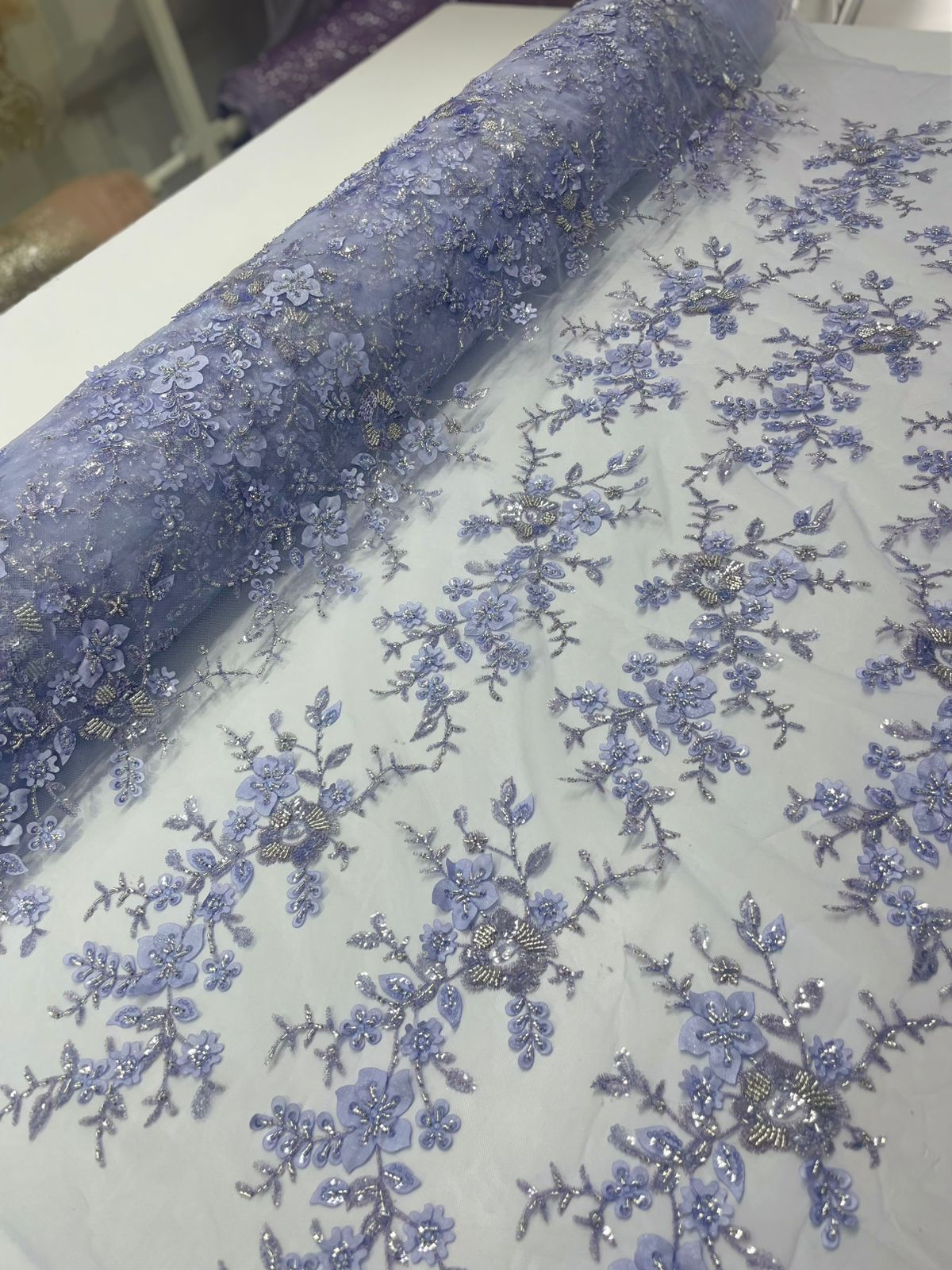Hermoso tul flor 3D con glitter, ideal para tus vestidos de alta costura.